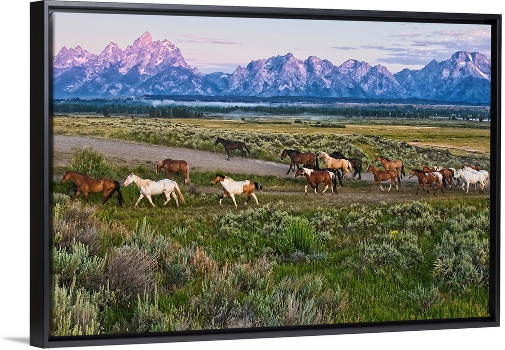 <p>Big canvas photo of a group of horses walking through an open field with rugged mountains in the distance at sunset.</p>