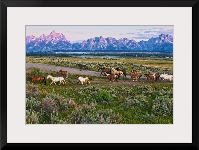<p>Big canvas photo of a group of horses walking through an open field with rugged mountains in the distance at sunset.</p>