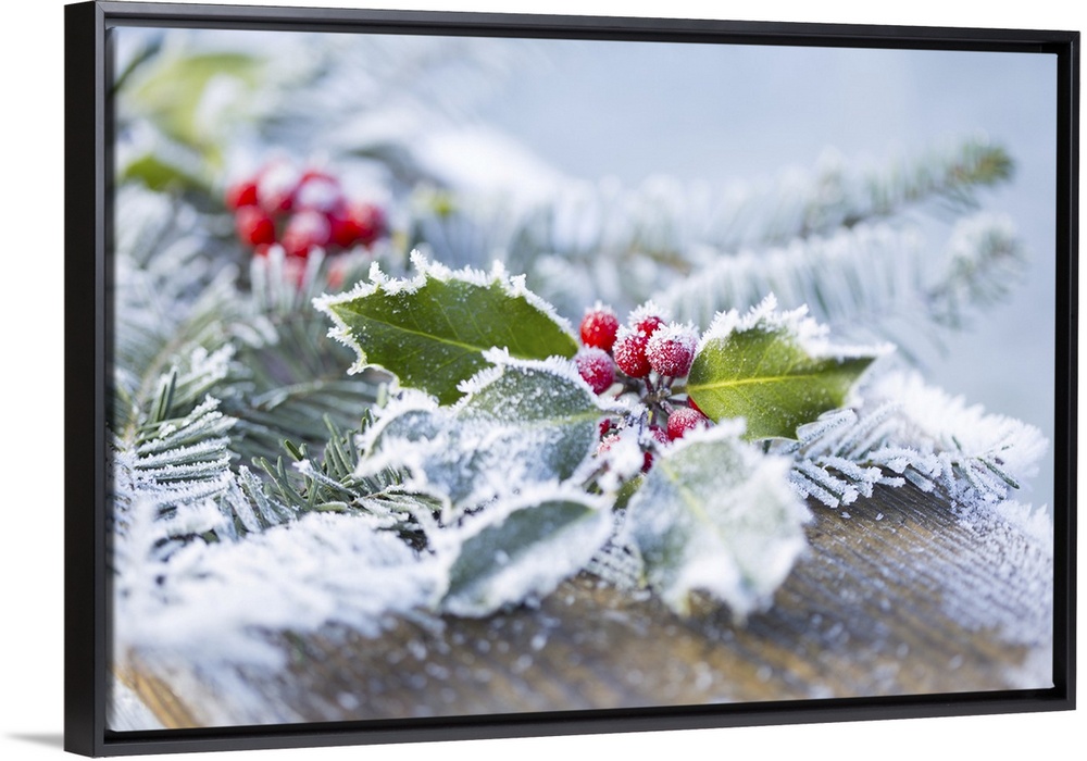 <p>A holly branch with berries and fir boughs covered in frost on a wooden board in selective focus, British Columbia, Canada.</p>