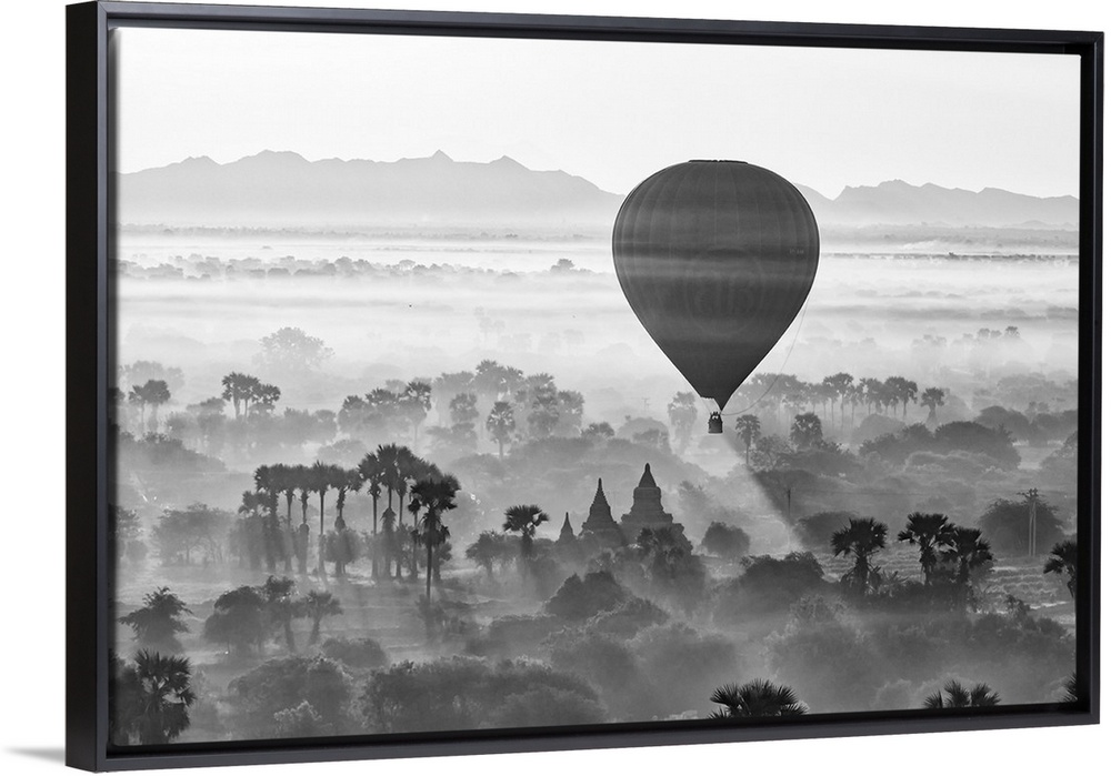 <p>A hot air balloon flies over trees and a temple at sunrise on a misty morning, Bagan, Myanmar.</p>