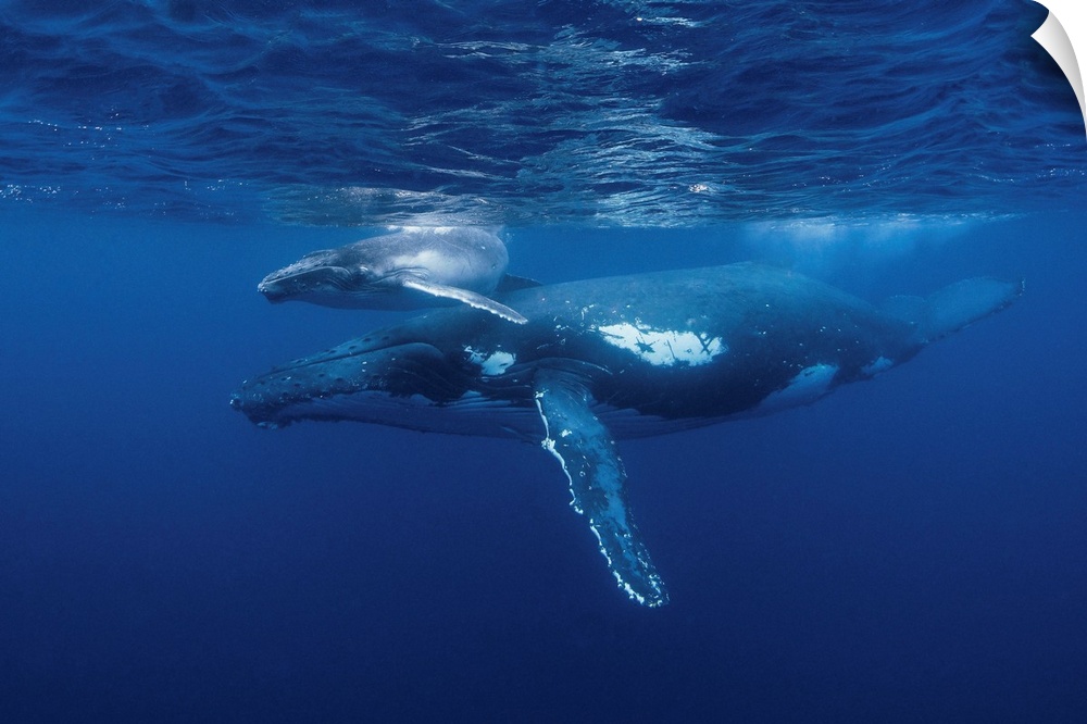 <p>A humpback whale and her calf play near the surface.</p>