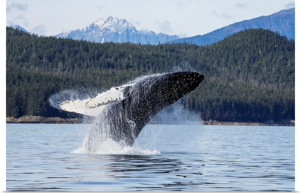 <p>A Humpback Whale Breaches As It Leaps From The Calm Waters Of Stephens Passage Near Tracy Arm In Alaska's Inside Passage. Admiralty Island's Forested Shoreline Beyond, Tongass Forest.</p>