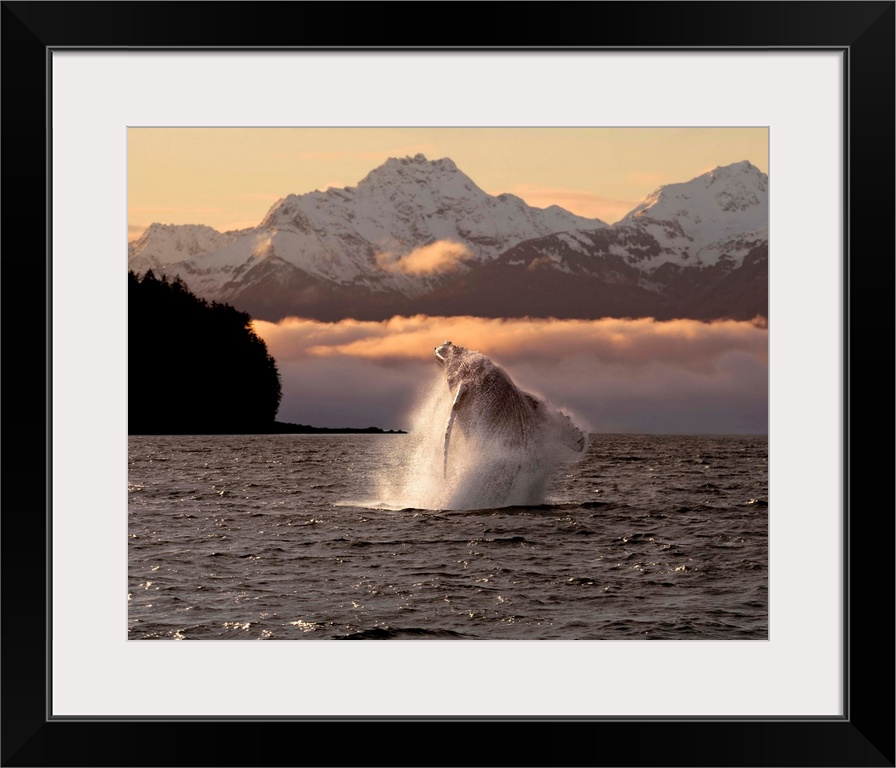 <p>Composite:A Humpback Whale Breaches In Alaska's Inside Passage At Sunrise, Eagle Peak, Admiralty Island Beyond, Southeast, Summer</p>