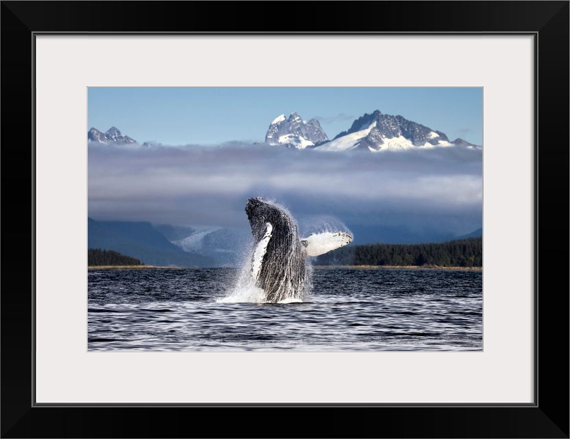 <p>A humpback whale breaches, leaping from Lynn Canal in Alaska near Juneau. Herbert Glacier and snowcapped mountains of Coastal Range beyond, Tongass National Forest.</p>