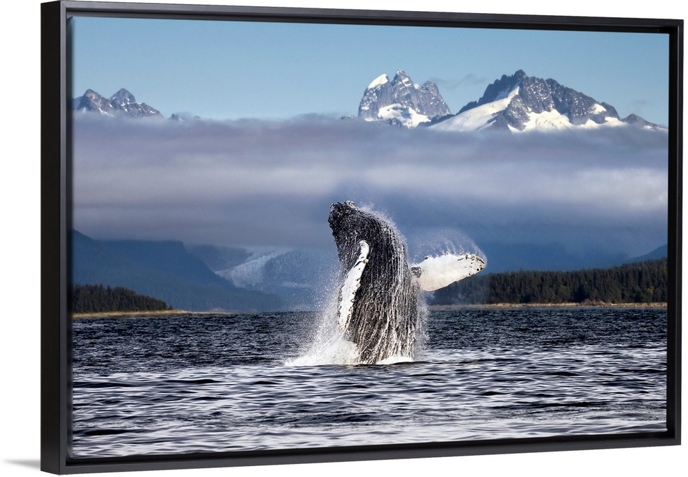 <p>A humpback whale breaches, leaping from Lynn Canal in Alaska near Juneau. Herbert Glacier and snowcapped mountains of Coastal Range beyond, Tongass National Forest.</p>