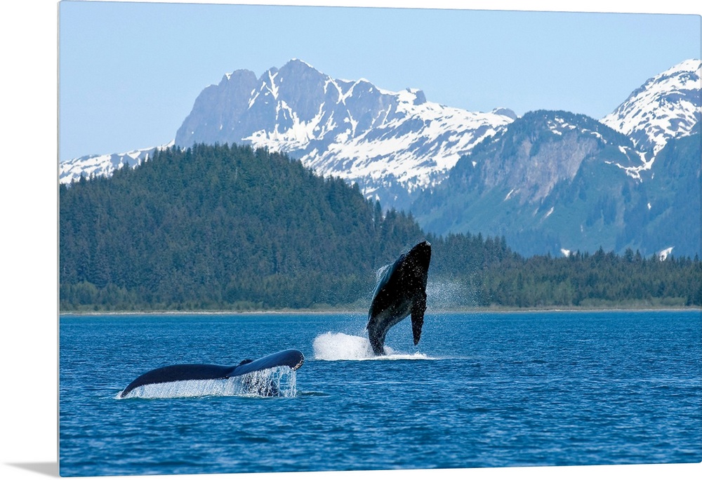 <p>A young whale breaches Alaskan water as only its mothers tail fin is shown. Trees and snow covered mountains line the background of this picture.</p>