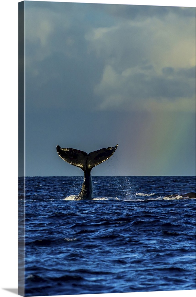 <p>A humpback whale fluke next to a rainbow in the Pacific Ocean.</p>