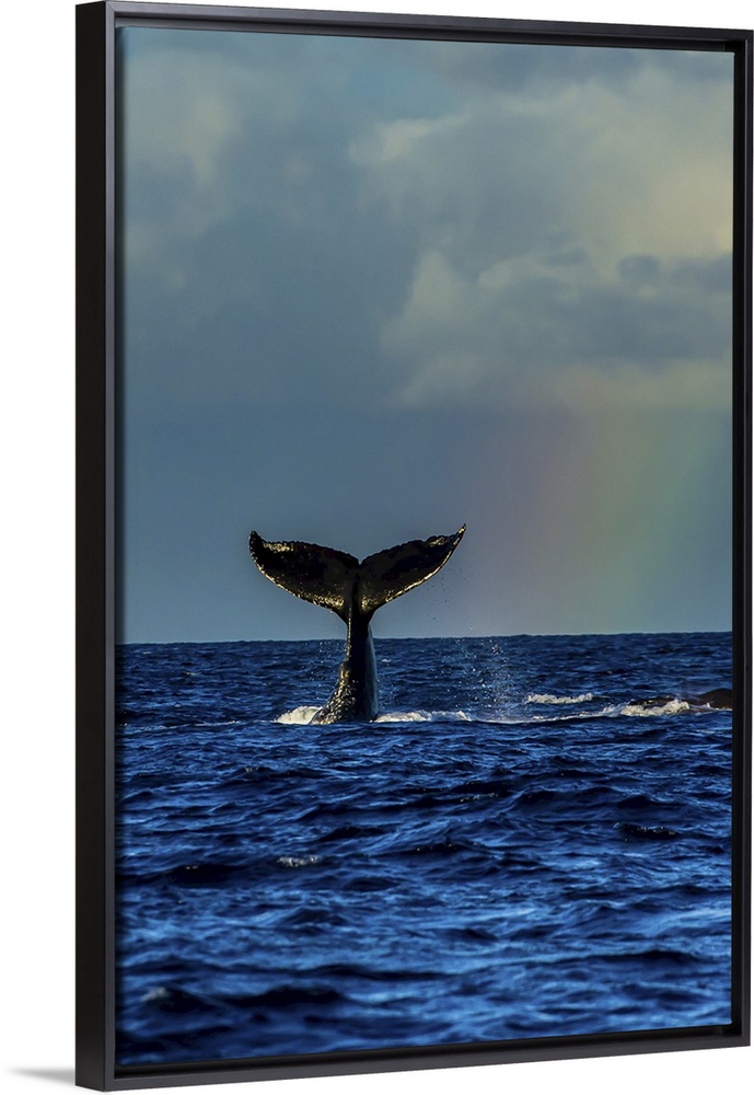<p>A humpback whale fluke next to a rainbow in the Pacific Ocean.</p>