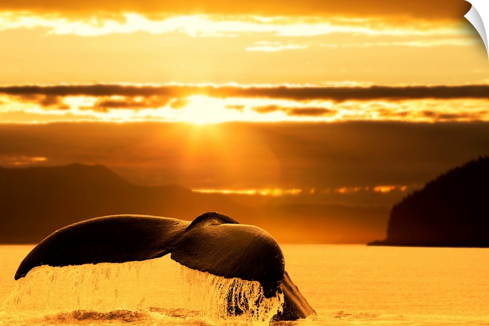<p>A Humpback Whale returns to the depths of Alaska's Inside Passage as the sun begins to set, Stephens Passage, near Juneau.</p>