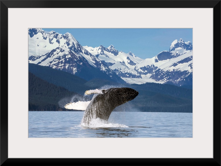 <p>A humpback whale leaps (breaches) from the calm waters of Lynn Canal in Alaska near Juneau. Herbert Glacier and snowcapped mountains of Coastal Range beyond, Tongass National Forest.</p>
