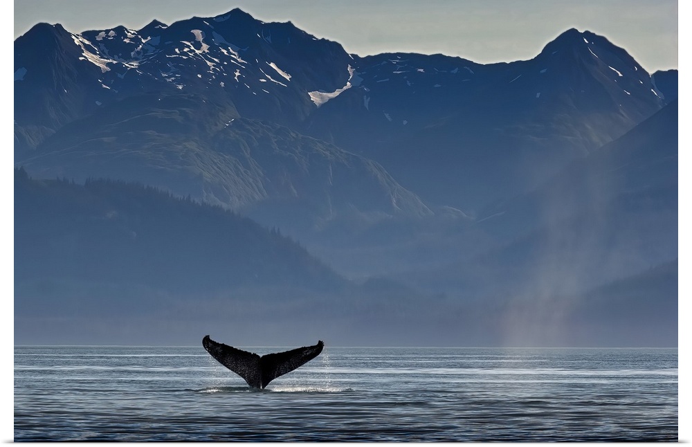<p>A humpback whale (Megaptera novaeangliae) surfaces and dives into Stephens Passage. Studies show the humpback from Southeast Alaska travels mostly to Hawaii to breed and returns in the summer to the cold Alaskan waters; Southeast Alaska, Alaska, United States of America</p>