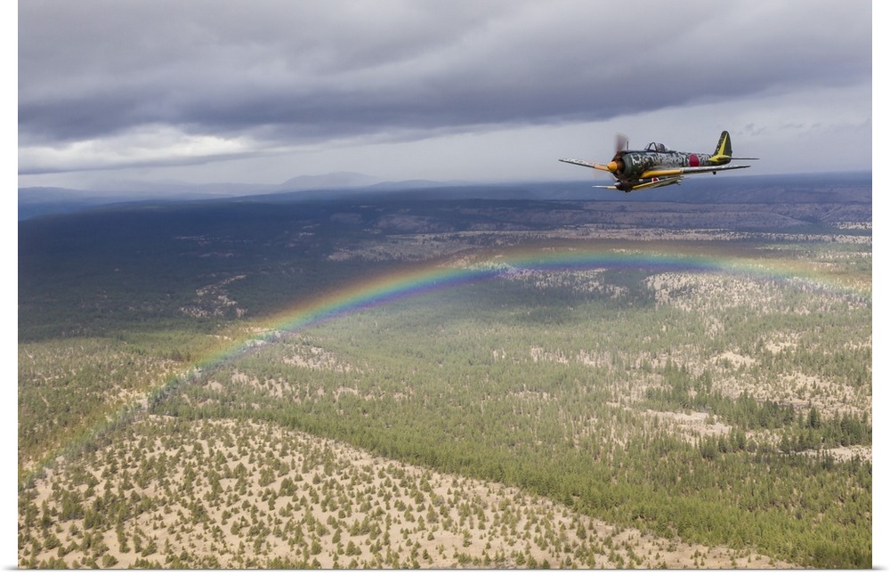 <p>A Japanese A6M Zero and a Ki-43 Oscar fly in formation above a rainbow over Madras, Oregon.</p>