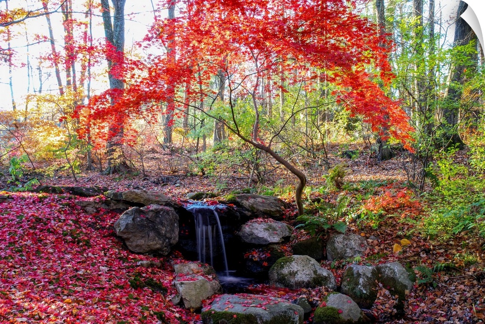 <p>A Japanese maple tree with red leaves in the fall, next to a waterfall</p>