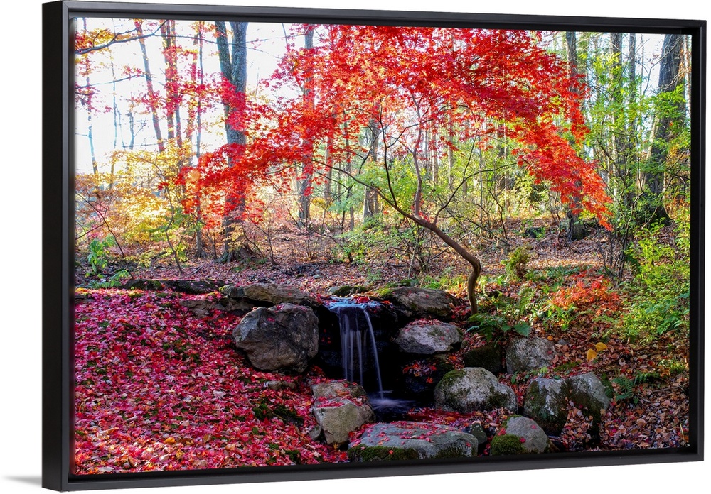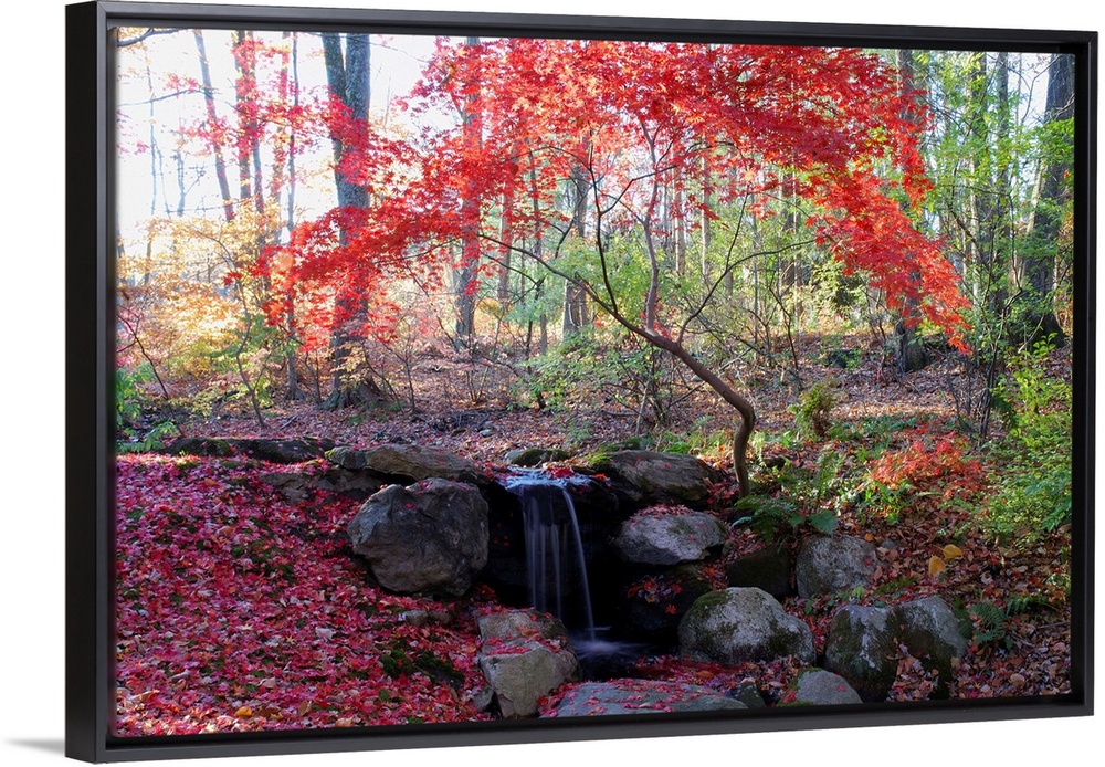 <p>A Japanese maple tree with red leaves in the fall, next to a waterfall</p>