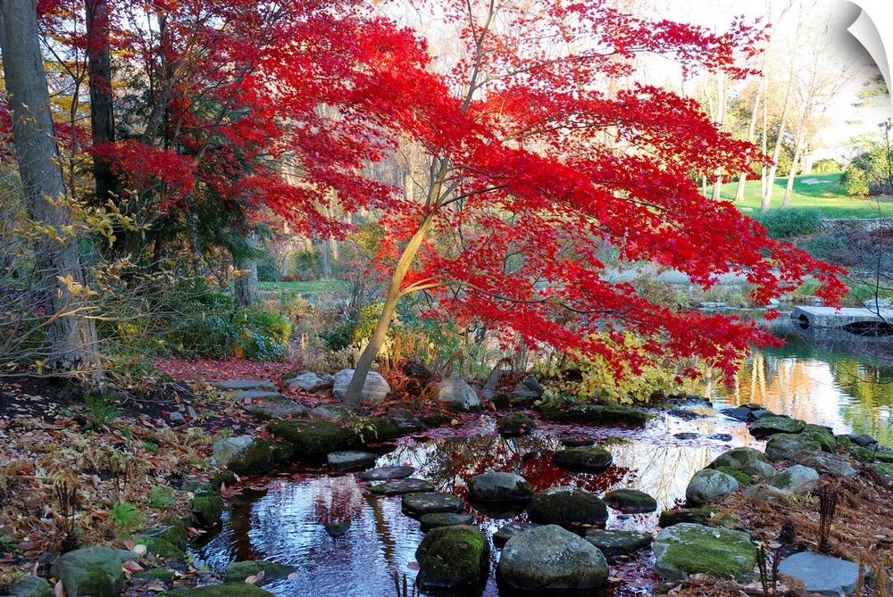 <p>A Japanese maple with colorful, red foliage at a stream's edge.</p>