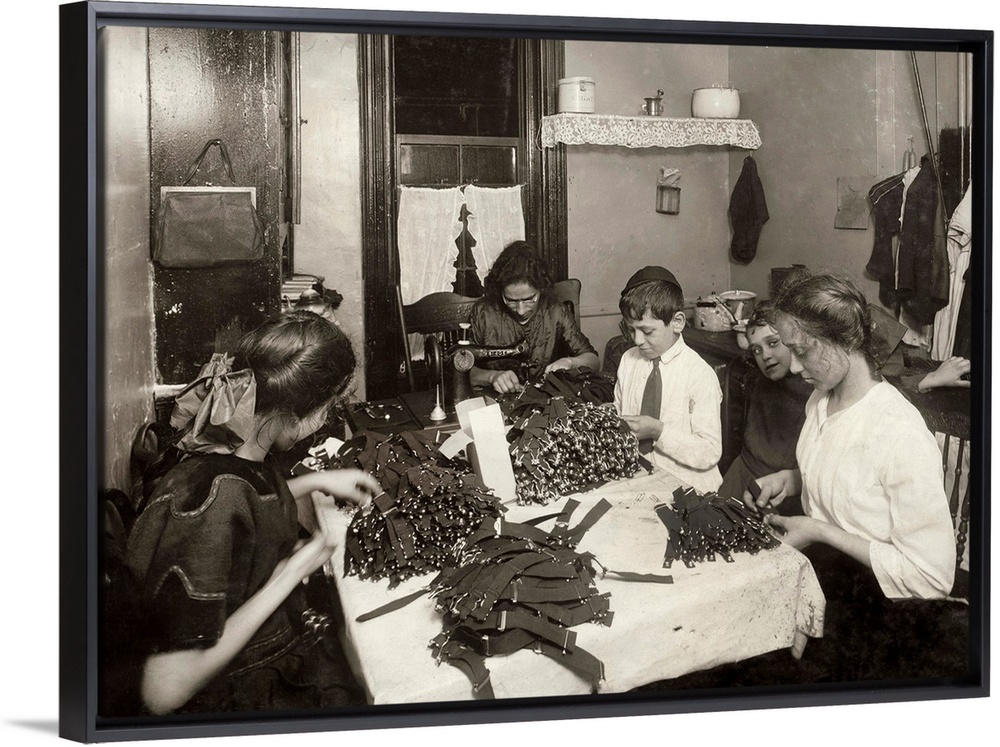 <p>A Jewish family making garters in the kitchen of their tenement home in New York City, New York. Photograph by Lewis Wickes Hine, November 1912.</p>
