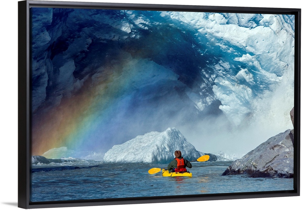 <p>A kayaker explores a melt stream gushing from beneath Mendenhall Glacier, Mendenhall Lake, Tongass National Forest, Juneau, Alaska</p>