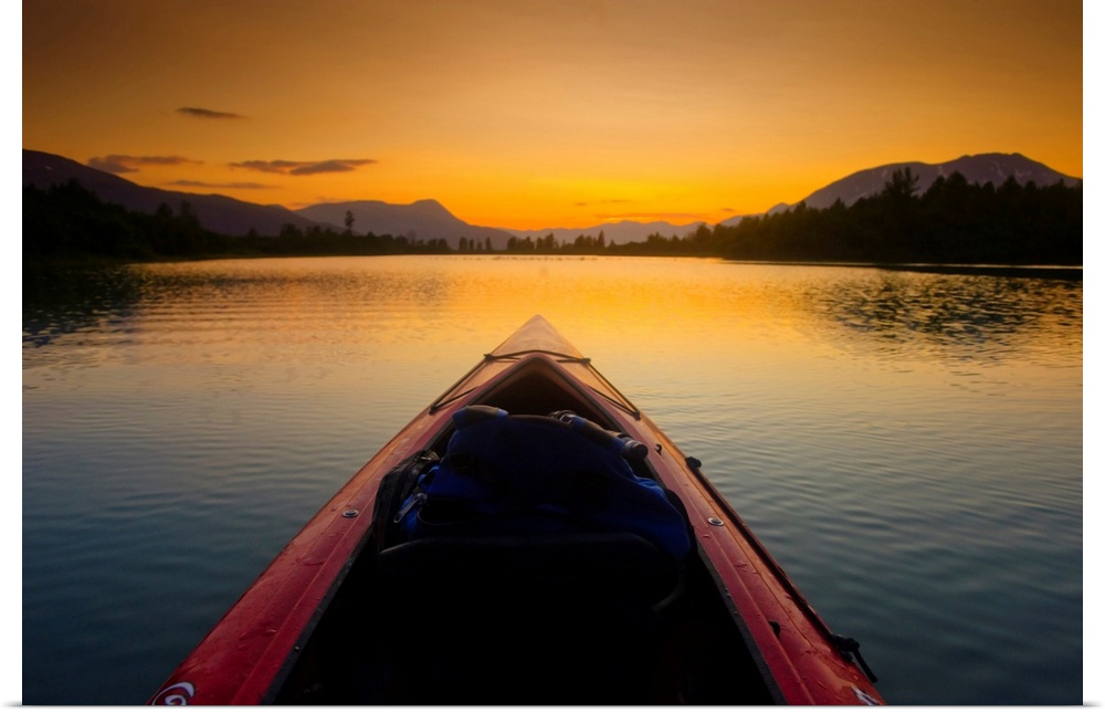 <p>A Kayaker's Perspective While Crossing A Calm Lake At Sunset, Alaska</p>