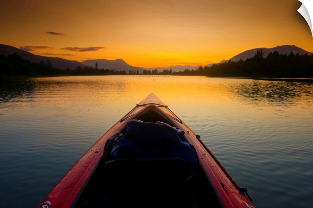 <p>A Kayaker's Perspective While Crossing A Calm Lake At Sunset, Alaska</p>