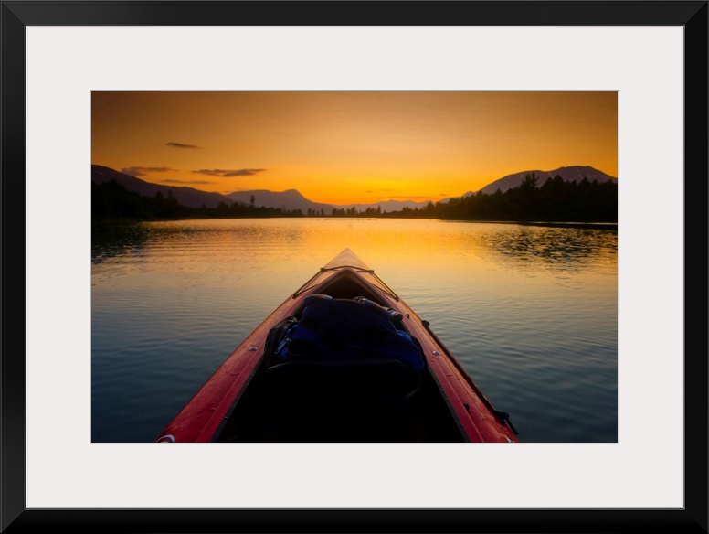 <p>A Kayaker's Perspective While Crossing A Calm Lake At Sunset, Alaska</p>