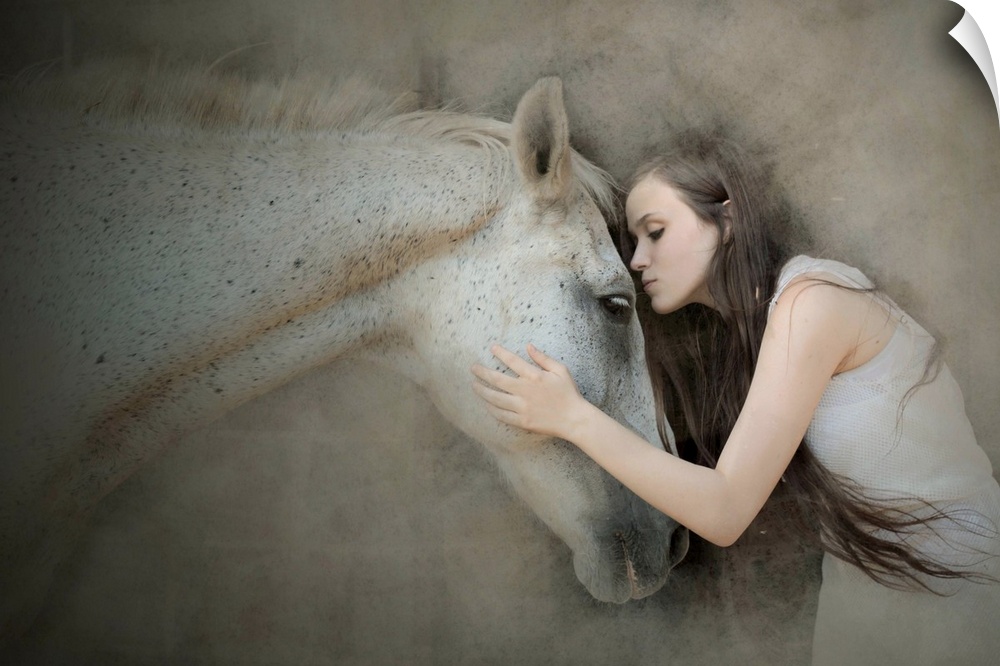 <p>A young woman with long hair leaning forward to kiss a white horse on the forehead.</p>