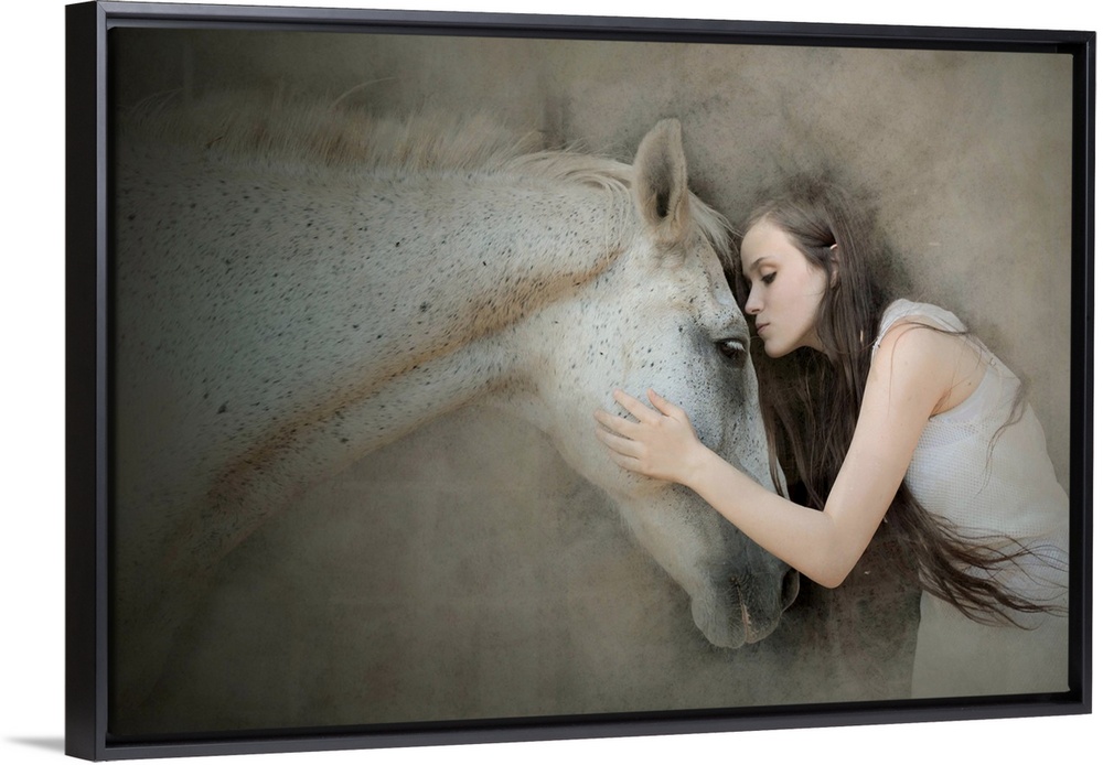 <p>A young woman with long hair leaning forward to kiss a white horse on the forehead.</p>
