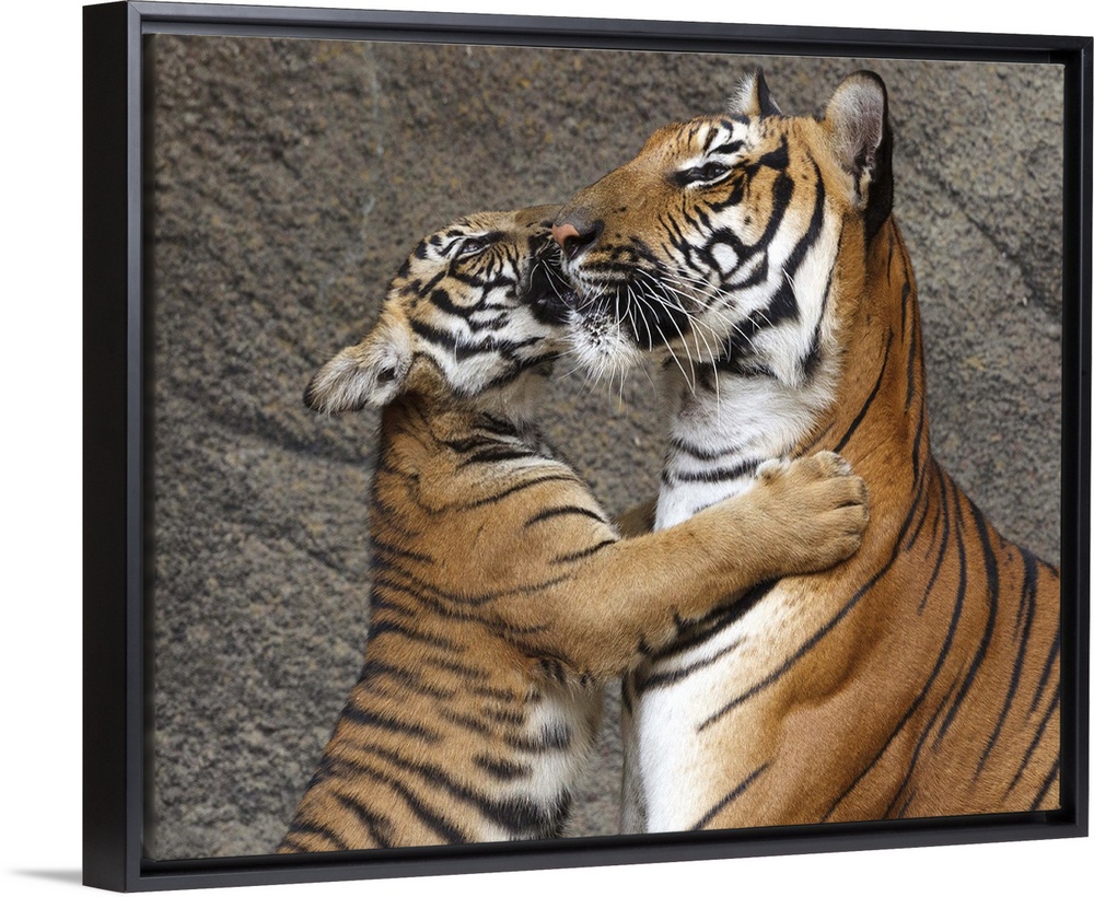 <p>Photograph of a young tiger hugging its mother and nuzzling.</p>