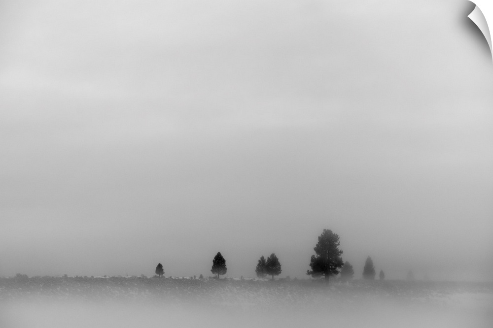 <p>A landscape in fog scattered with a few trees and dense cloud in the sky; California, United States of America</p>