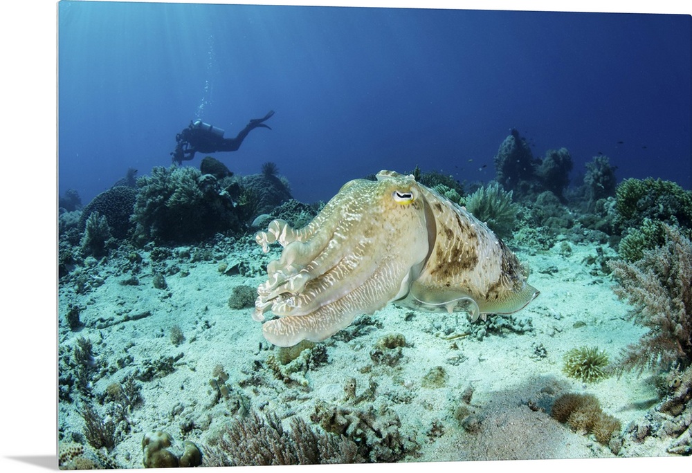 <p>A large broadclub cuttlefish, Sepia latimanus, hovers over a coral reef.</p>