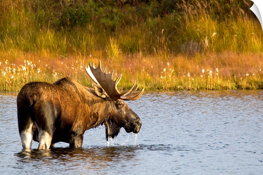 <p>This Alaskan wall art is a moose that is looking back at the camera as he crosses water to reach the opposite shore covered with grass.</p>