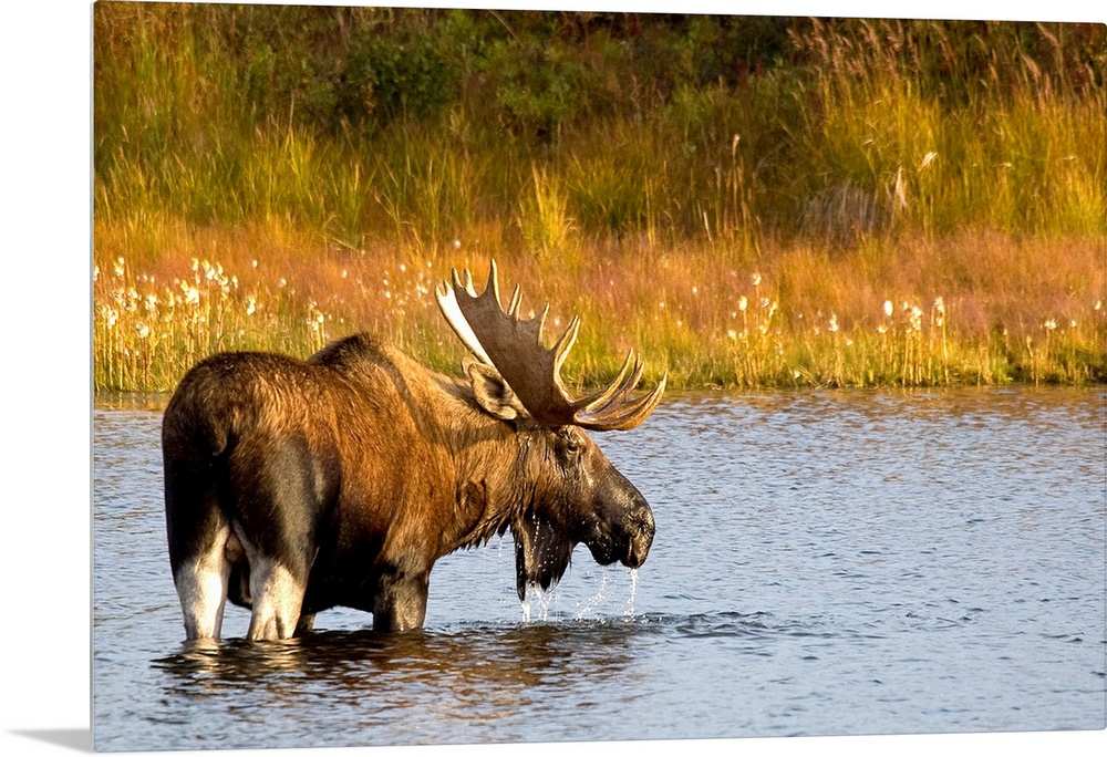 <p>This Alaskan wall art is a moose that is looking back at the camera as he crosses water to reach the opposite shore covered with grass.</p>
