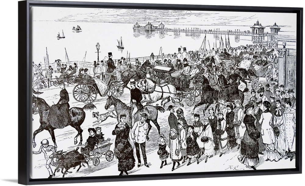 <p>Illustration depicting a busy scene next to the sea during the summer holidays. A large crowd is shown traveling down Kings Road, Brighton, riding horseback, walking and riding in carriages. Dated c1877.</p>