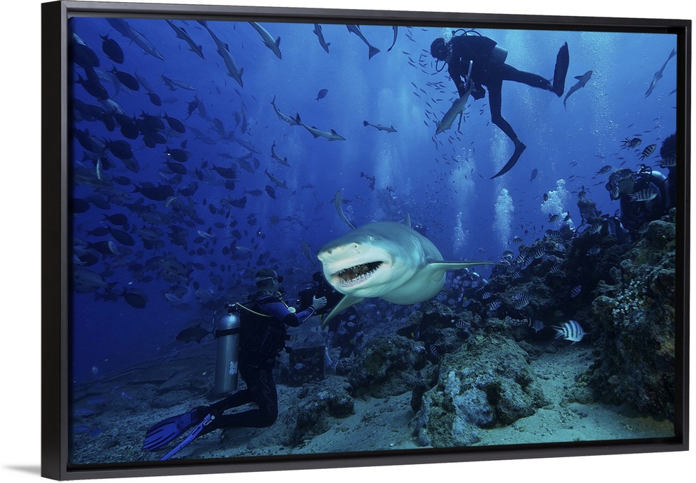 <p>A large Lemon Shark gulps down a large tuna head in front of a crowd of divers, Fiji.</p>