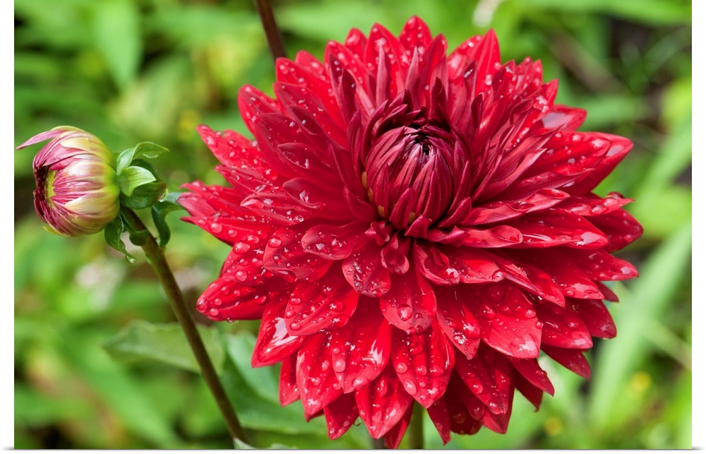 <p>A large red dahlia flower and bud covered in water drops.</p>