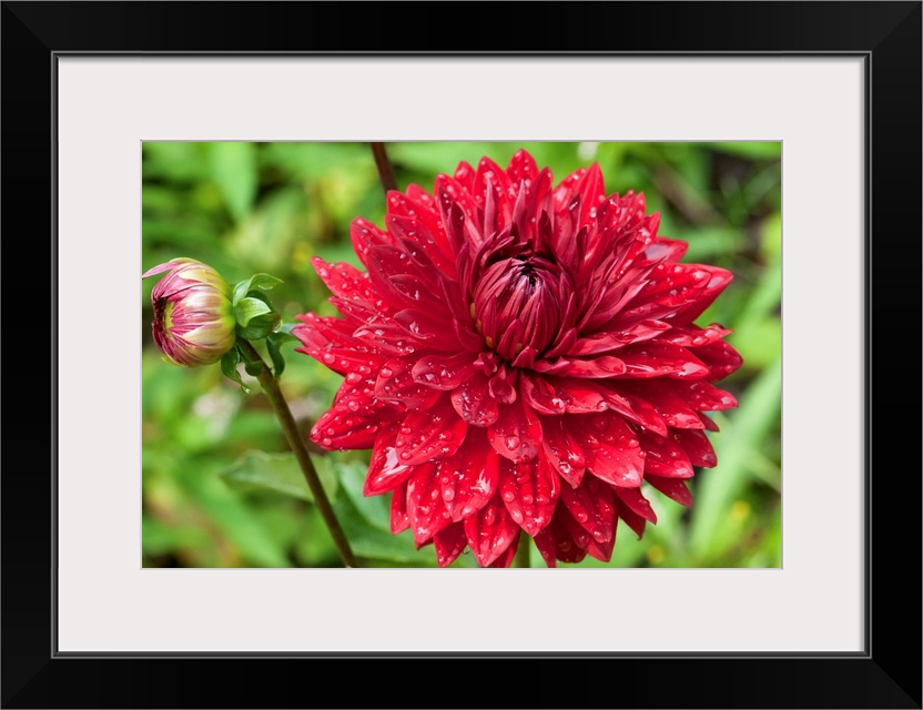 <p>A large red dahlia flower and bud covered in water drops.</p>