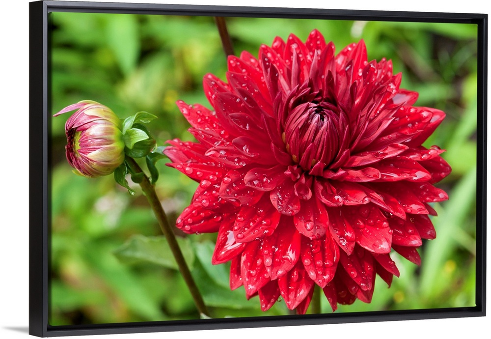 <p>A large red dahlia flower and bud covered in water drops.</p>