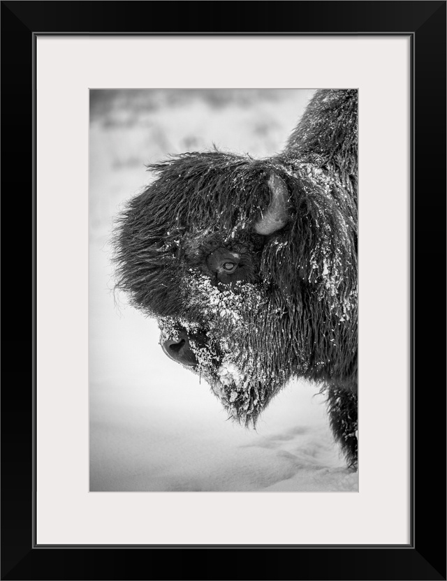 <p>A large, snowy bull wood bison (bison bison athabascae), Alaska wildlife conservation center, portage, Alaska, united states of America.</p>