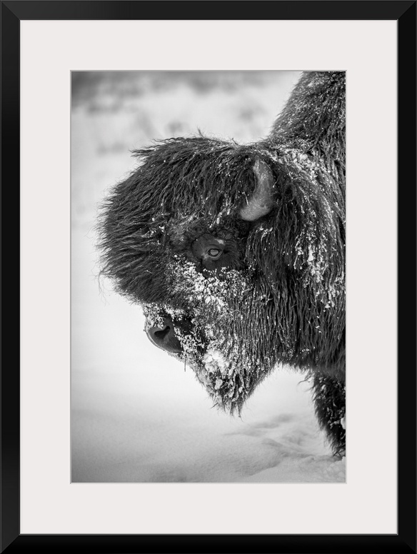 <p>A large, snowy bull wood bison (bison bison athabascae), Alaska wildlife conservation center, portage, Alaska, united states of America.</p>