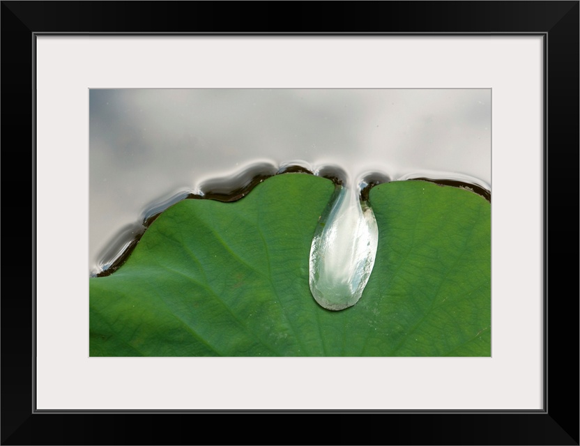 <p>A large water drop puddling atop a water lily leaf.</p>