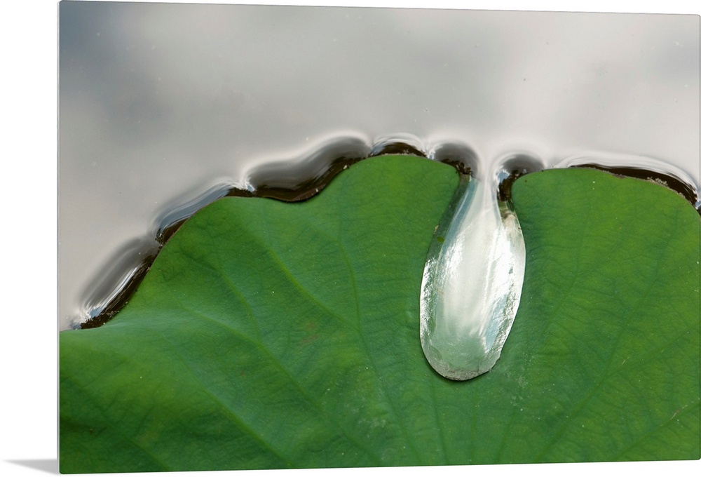 <p>A large water drop puddling atop a water lily leaf.</p>
