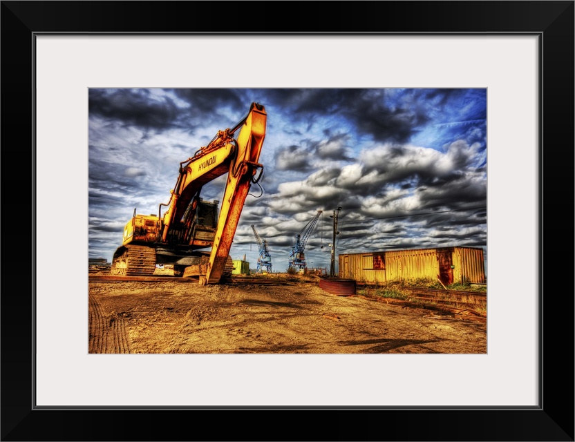<p>A large yellow digger with caterpillar tracks on a building site with cranes in the distance and ominous dark clouds below a blue sky</p>