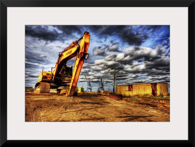 <p>A large yellow digger with caterpillar tracks on a building site with cranes in the distance and ominous dark clouds below a blue sky</p>