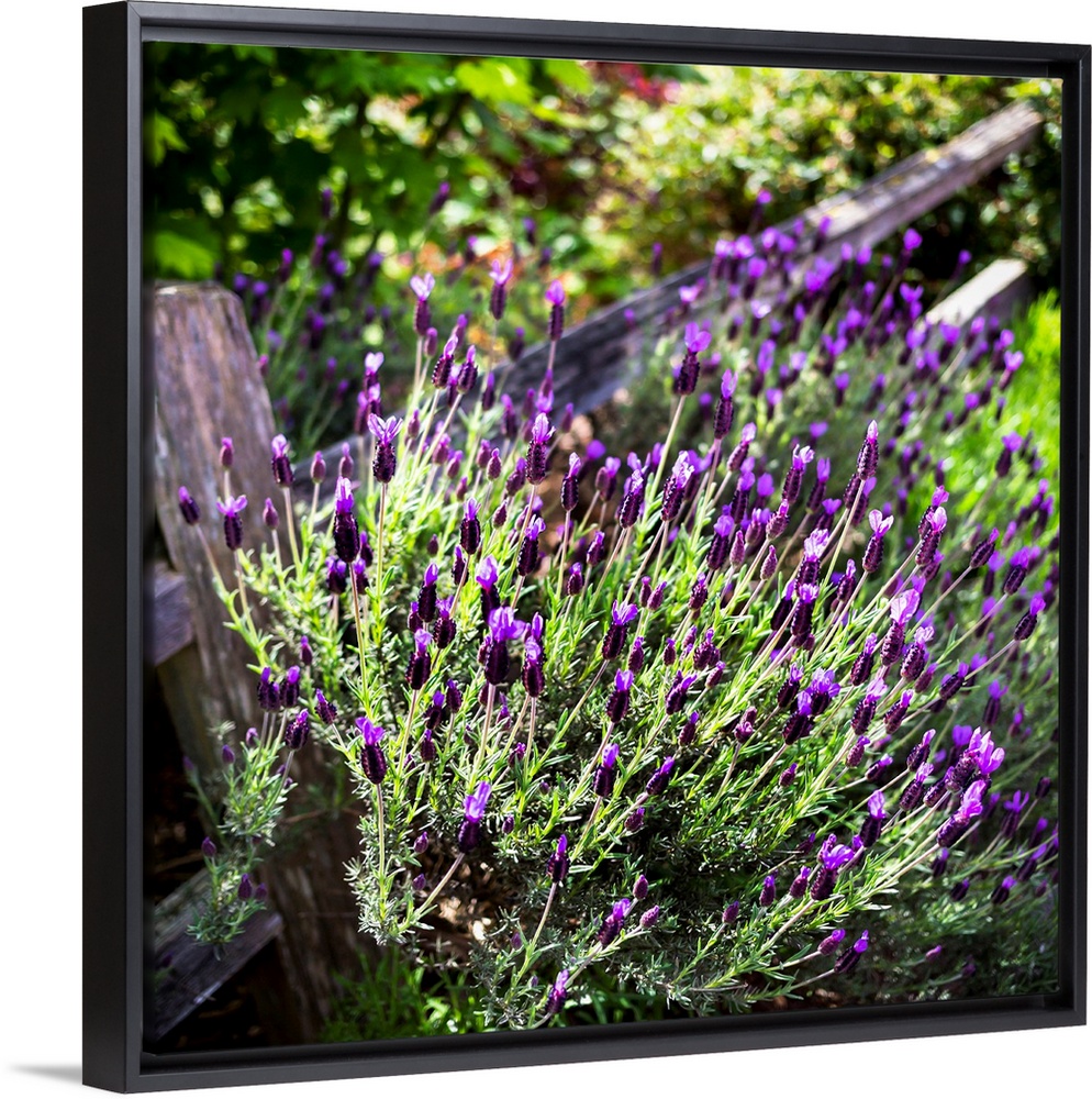 <p>A lavender plant growing in a garden beside a wooden rail fence; Whidbey Island, Washington, United States of America</p>