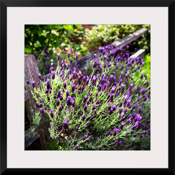 <p>A lavender plant growing in a garden beside a wooden rail fence; Whidbey Island, Washington, United States of America</p>