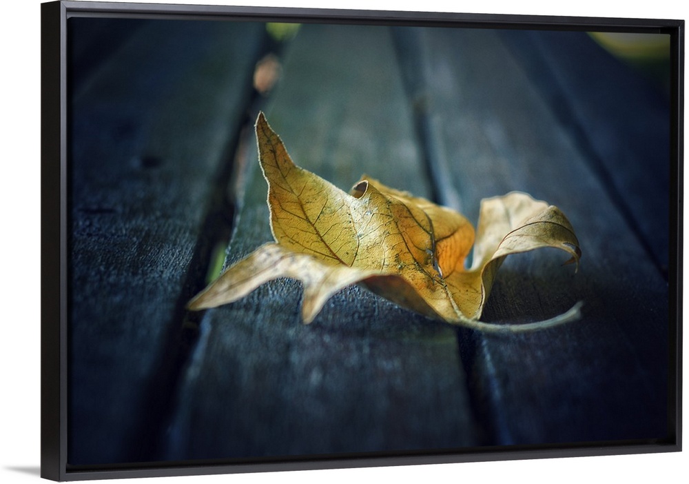 <p>A fallen leaf resting on a dark wooden bench.</p>