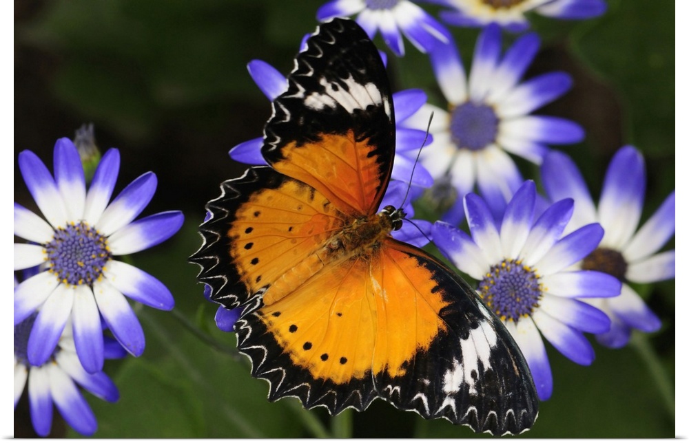 <p>A leopard lacewing butterfly, Cethosia cyane, pollinating daisies. Westford, Massachusetts.</p>