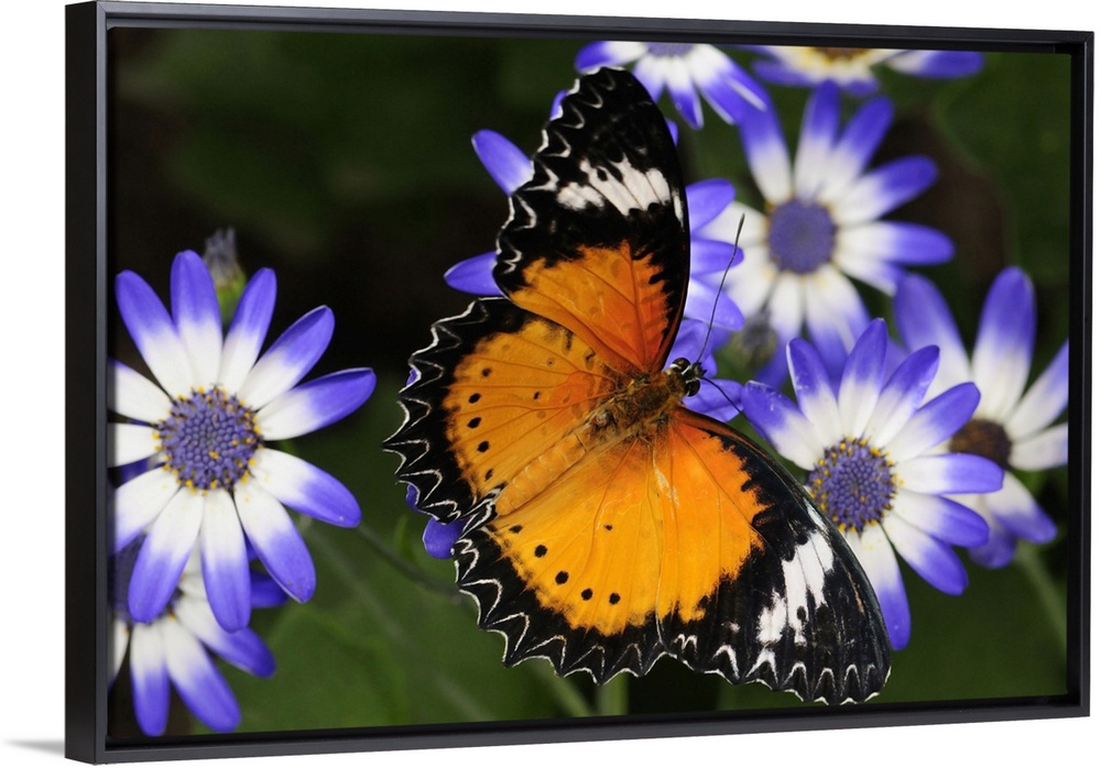 <p>A leopard lacewing butterfly, Cethosia cyane, pollinating daisies. Westford, Massachusetts.</p>