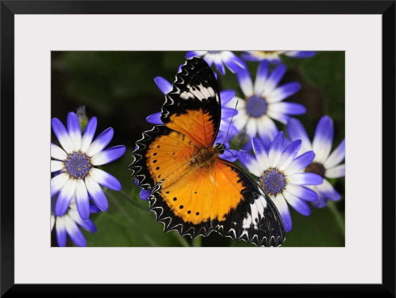 <p>A leopard lacewing butterfly, Cethosia cyane, pollinating daisies. Westford, Massachusetts.</p>