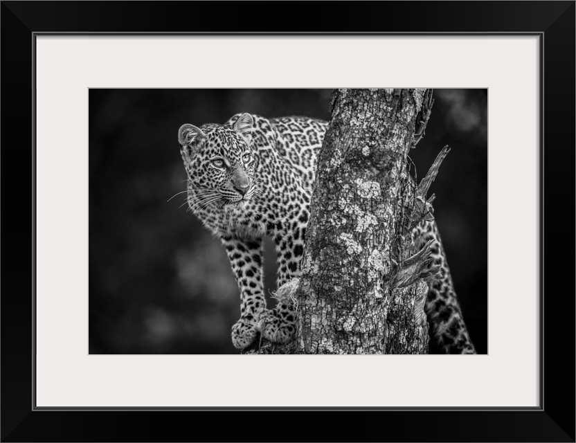 <p>A leopard (Panthera pardus) stands in a tree that is covered in lichen. It has black spots on its brown fur coat and is turning its head to look up. Shot with a Nikon D850 in the Masai Mara; Kenya.</p>