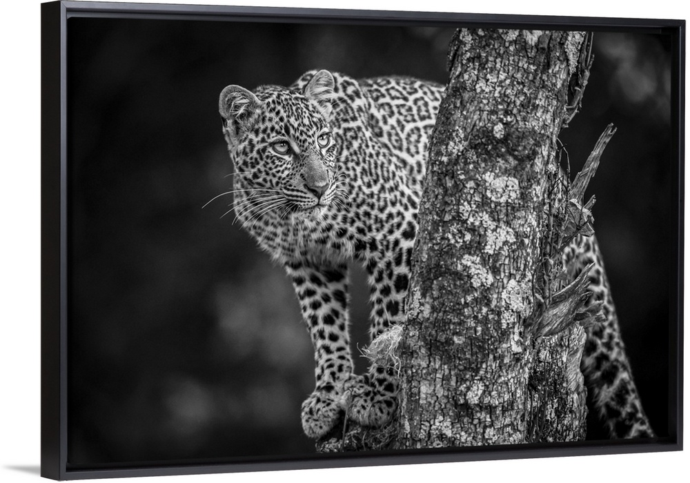 <p>A leopard (Panthera pardus) stands in a tree that is covered in lichen. It has black spots on its brown fur coat and is turning its head to look up. Shot with a Nikon D850 in the Masai Mara; Kenya.</p>
